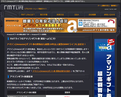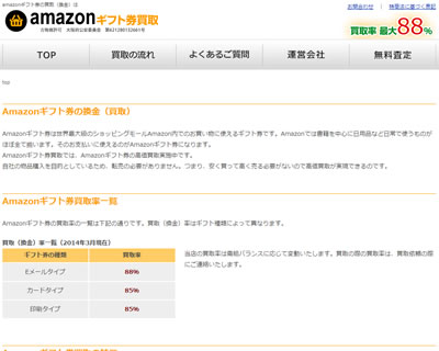埼玉県さいたま市に本社を置く株式会社サイバーエージェンシーによるAmazonギフト券の買取サービス。買取を行っているAmazonギフト券は新規発行のEメールタイプのみで、換金率は最大87%と他の業者と比較して高い訳ではないが、もともとRMT(リアルマネートレード)の仲介業者としてバーチャル通貨の買取・販売に実績がある会社だけに、サービスの信頼性は高い。