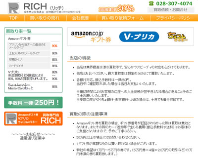 栃木県宇都宮市に本社を置くゴールドネット株式会社によるAmazonギフト券の買取サービス。換金率は業界最高水準の最大90%。換金率は落ちるが印刷タイプやカードタイプの買取にも対応している。またAmazonギフト券に加え、Vプリカの買取に対応している点もRICHの特徴と言えるだろう。